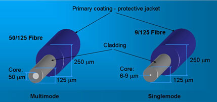 這些不同的路徑被稱(chēng)為空間模式,因此描述為多模光纖。單模光纖電纜具有小芯,其僅允許光線的一條路徑穿過(guò)光纖,因此描述為單模光纖。多模光纖通常具有兩種不同的芯尺寸:50微米或62.5微米。單模電纜采用9微米玻璃芯。